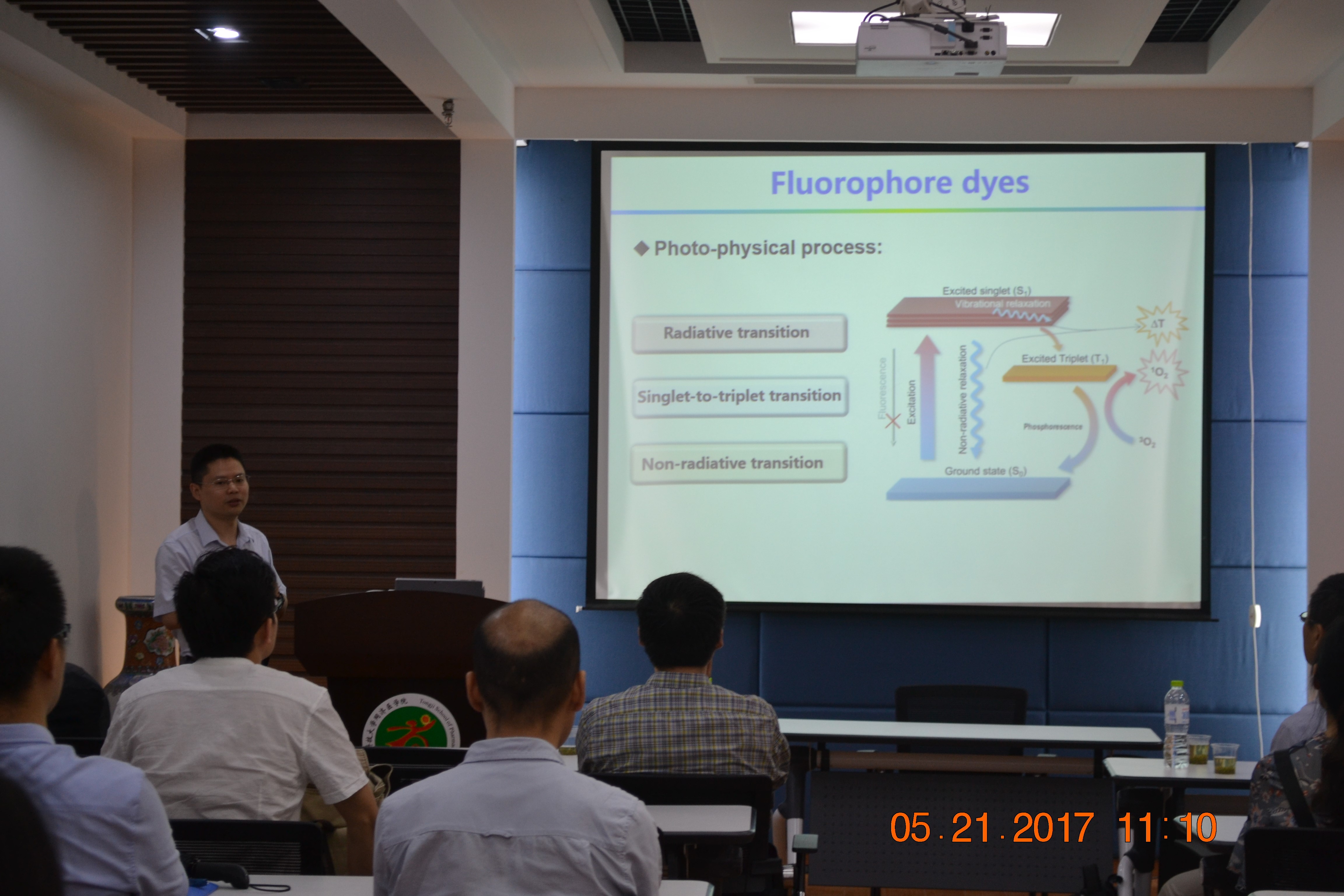 在近一个小时的报告中陈华兵教授介绍了所带领课题组近期关于纳米颗粒光动力和光热双重治疗肿瘤的研究成果,其中包括通过选取不同的光敏剂,对光敏剂进行各种修饰以期达到更少的荧光转换、更好的光治疗效果以及更弱的光漂白效应,并且对光敏感剂在不同状态和不同激发波长下的体内外效应进行了研究。陈华兵教授在报告过程着重讲述了光敏感纳米粒的治疗机理和相关的光物理理论以及在肿瘤治疗中光动力和光热治疗的关系,内容详实,幽默生动,多次与员工互动交流让大家进一步了解到各种光动力和光热治疗相关研究,赢得师生的一致好评。同学们也从报告中学习到了很多有益的经验,认识到理论与实践相结合的重要性。