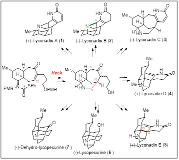 杨旸教授团队一直致力于具有良好生物活性的复杂天然产物的全合成研究。石松类生物碱是从蕨类植物石松及其近缘植物中分离得到的结构相似且骨架多变的一类天然产物。很多石松类生物碱有良好的神经营养活性,其中最为著名的是石杉碱甲。为实现多个具有良好神经营养活性的石松类生物碱的发散性合成,该团队发展了一种新颖的过渡金属Pd催化的Heck环化反应来构建合成难度很高的七元桥环骨架,进而实现了对[4.2.1], [4.3.1]及[6/6/7]等多种氮杂桥环化合物的合成,并将此方法应用到了石松类生物碱Lyconadins A-E的不对称全合成研究。团队从关键的[6/6/7]-氮杂桥环中间体出发,经过一系列官能团化操作最终实现了多个天然产物Lyconadins A-E的高效合成,其中天然产物Lyconadins D和E为首次全合成。该项研究工作为一系列具有良好神经营养活性的石松类生物碱的全合成奠定了基础,对筛选针对神经系统疾病的药物先导化合物具有重要意义。