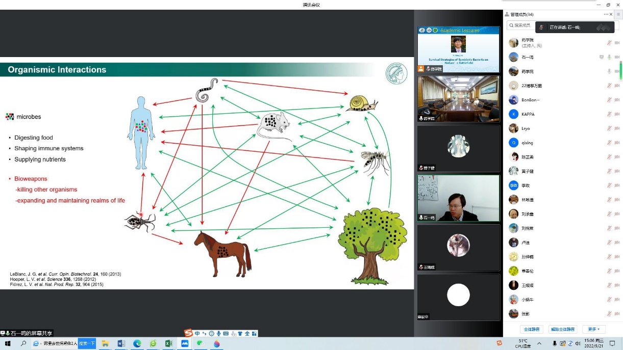 石一鸣研究员以“Survival Strategies of Symbiotic Bacteria on Nature’s Battlefield(共生细菌在自战场的生存策略)”为题目,开展了关于从分子水平探究和阐明分子微生物与高等真核生物之间相互作用的学术报告。报告主要从新颖生物合成基因簇挖掘、生物合成途径工程改造、生物合成产物结构鉴定、分子生态学功能以及分子活性功能等角度层层递进。