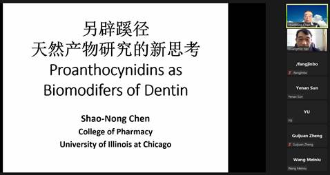 2023年4月7日,美国伊利诺伊大学芝加哥分校陈绍农教授应邀在ZOOM平台(ZOOM会议号86105509071,https://us06web.zoom.us/j/86105509071?pwd=K3NlMDlCdlNybzdLZjlYNFpGMGpydz09)为全院师生做了题为“另辟蹊径--天然产物研究的新思考Proanthocynidins as Biomodifers of Dentin”的精彩报告。报告会由姚广民教授主持,TapTap点点阮汉利教授等29名师生在线参加。
