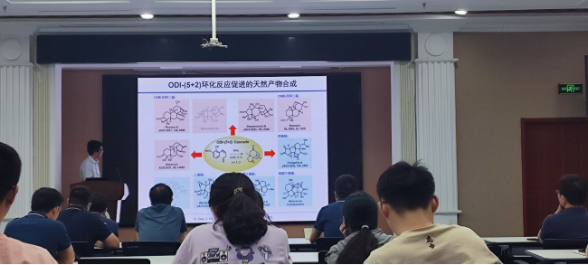 丁教授本次报告重点介绍了基于氧化去芳香化促进(ODI−)的(5+2)环化反应及其在四环二萜和多奎烷类天然产物全合成中的重要应用价值。丁教授首先介绍了ODI−(5+2)环化反应。接着介绍了他们课题组基于ODI−(5+2)反应在四环二萜类天然产物全合成取得的成果,实现了多种对映-贝壳杉烷的简洁、高效全合成。在介绍多奎烷类天然产物全合成的过程中,丁教授讲述了他们在全合成过程中遇到的困难,独辟蹊径通过“缓释保护基”的方法,成功通过22步成功合成了姚广民教授从湖北蕲春地区羊踯躅中分离得到的新骨架二萜化合物RhodomollanolA。丁教授的演讲为活性天然产物全合成研究提供了宝贵经验和应用实践,开拓了研究新思路。