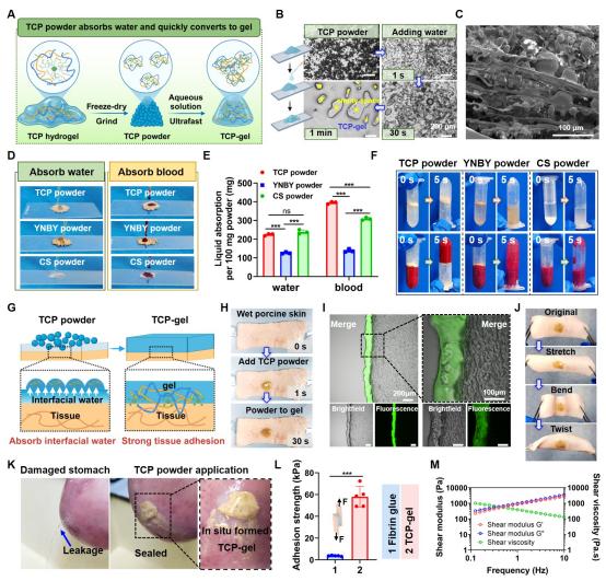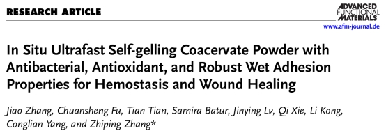 近日,张志平教授团队在国际权威期刊Advanced Functional Materials发表了题为“In Situ Ultrafast Self-gelling Coacervate Powder with Antibacterial, Antioxidant, and Robust Wet Adhesion Properties for Hemostasis and Wound Healing”的研究论文。该团队受海洋贻贝中儿茶酚介导的液液相分离动态黏附机理启发,开发了一种多功能凝聚体粉末(TCP粉末),由单宁酸(TA)、壳聚糖(CS)和聚乙二醇(PEG)组成。该粉末能够在吸收界面水分后迅速自成胶,形成与湿润组织表面紧密结合的水凝胶,通过超强黏附实现快速止血,在大鼠出血模型以及猪严重出血模型中展现出显著优于商业化止血材料的止血效果。进一步利用凝聚体粉末的自凝胶化特性整合富血小板血浆(PRP)/甲磺酸去铁胺(DFO)治疗方案,构建载药多功能凝胶敷料(DP@TCP-gel),从而满足复杂伤口对于“抗菌-抗氧化-促血管化”多功能耦合的需求,加速普通急性伤口、糖尿病大鼠慢性伤口以及感染性伤口愈合。此外,TCP粉末通过冻干和研磨工艺制备,具有简单易行、可大规模生产和长期储存等优点,为临床应用提供了便利。这种新型TCP粉末的开发为提高止血和伤口愈合材料的性能和临床应用价值提供了新的思路。