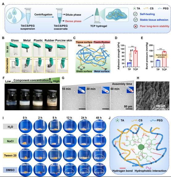 作者首先利用TA、CS和PEG制备了TCP凝聚体凝胶,此凝胶展现出优异的湿润界面黏附能力。利用共聚焦显微镜、扫描电子显微镜以及各类相互作用力破坏剂解析出其成胶机制由氢键和疏水相互作用驱动的液液相分离过程所主导。