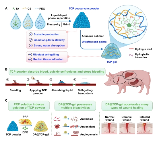 图1:自凝胶化TCP凝聚体粉末的构建及其在止血和伤口愈合中的应用研究示意图。(A)TCP凝聚体粉末制备示意图及其自凝胶化特性与临床应用优势;(B)TCP凝聚体吸收血液并迅速转变为强黏附性凝胶实现猪颈动脉、肝脏和脾脏出血模型止血;(C)协同TCP凝聚体粉末与PRP/DFO构建多功能载药凝胶敷料(DP@TCP-gel)及其在不同类型伤口修复中的应用。