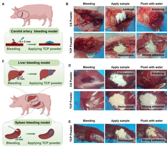 图4:TCP凝聚体粉末在猪颈总动脉出血模型、肝出血模型以及脾脏出血模型中实现有效止血。