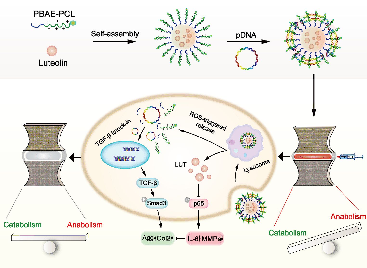 图1. ROS响应TGF-β1质粒-LUT共载类病毒纳米粒的构建及其IDD综合治疗分子机制