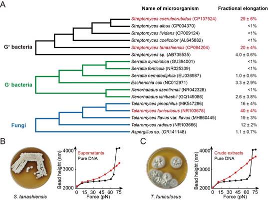单分子操纵技术如光镊、磁镊、原子力显微镜能够实现对单个DNA和蛋白分子的力学操纵,并被广泛运用于DNA和小分子化合物相互作用的研究中。然而,此前的单分子技术并未用于复杂样品的直接检测,如微生物和植物提取物。本研究首次证明了在无需纯化的情况下,可以直接从5微升菌液或者微生物粗提物中鉴定纳摩尔级别的DNA嵌入剂。该检测基于DNA嵌入剂在受力时导致DNA末端长度增加的原理。这种DNA轮廓长度的增加是嵌入剂的特有现象,受溶液的离子条件,微生物初级代谢产物或蛋白质结合的影响很小。此外,对DNA施加外力能够提升化合物的结合亲和力并增加配体嵌入数量,提高检测灵敏度。因此,单分子操纵技术提供了一种无需纯化、高灵敏度和高特异性的新方法,用于挖掘微生物来源的DNA嵌入剂。