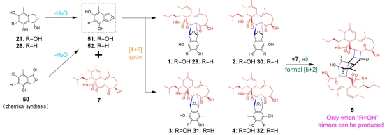 最后,亲双烯体7与双烯体51(或52)之间,可以通过级联的非酶促[4π + 2π] Diels-Alder反应和[5π + 2π]环加成反应,逐步产生mAPOs二聚体和三聚体。而epi簇中的黄素依赖氧化酶EpiG催化双烯体C3位的羟基化,这是形成mAPOs三聚体的关键步骤。