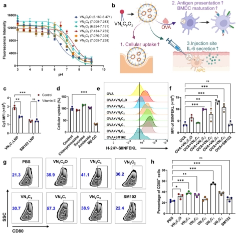 与传统商用脂质纳米颗粒(如SM102)相比,VNxCyOzLNP的细胞摄取效率显著提高了约1.8倍,这一提升主要归功于VE的引入。此外,研究者通过将VNxCyOzLNP与卵清蛋白及骨髓来源的树突状细胞共孵育,发现VNxCyOzLNP能够显著促进树突状细胞的成熟以及抗原肽的表达。这些结果表明,VNxCyOzLNP不仅在mRNA递送效率上表现出色,还具有激活免疫系统、增强抗原呈递的潜力,为免疫治疗提供了新的策略。