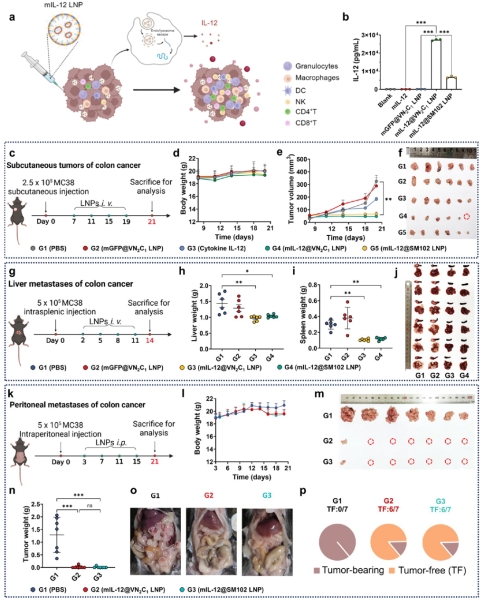 研究者进一步探索了VN2C1LNP在包封mIL-12时的疗效,并在多种结肠癌模型中进行了系统评估。实验结果显示,在皮下瘤模型中,使用mIL-12@VN2C1LNP治疗的小鼠,其疗效优于单独使用IL-12蛋白或mIL-12@SM102 LNP的对照组。在结肠癌肝转移模型中,通过全身给药的mIL-12@VN2C1LNP几乎完全抑制了肝脏转移瘤和脾脏原发肿瘤的生长。此外,在结肠癌腹膜转移模型中,mIL-12@VN2C1LNP也展现出良好的治疗效果,除一只小鼠外,其余所有小鼠均实现了完全治愈。在整个治疗过程中,未观察到IL-12全身给药通常伴随的体重下降等不良反应。
