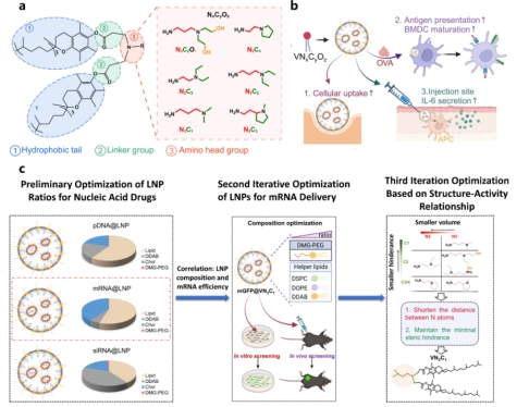 研究团队巧妙地以维生素E分子作为可电离脂质的疏水尾部核心,通过精细调控N原子周围的空间位阻以及连接键的长度等关键结构参数,成功开发出一系列新型功能脂质分子VNxCyOz。经三次迭代优化后得到了最优的可电离脂质结构及其组分比例。