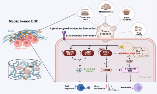 作者通过增殖、迁移、上皮-间质转化(EMT)、细胞凋亡和药物反应的变化来评估乳腺癌的恶性表型。将包括转录组学和代谢组学在内的多组学分析与分子生物学实验相结合,进一步研究细胞-基质相互作用对乳腺癌进展的潜在机制。基质结合EGF显著增强乳腺癌类器官恶性表型,在细胞因子-细胞因子受体相互作用和ECM-受体相互作用中发挥作用并促进L-天冬氨酸的合成来重编程乳腺癌能量代谢。