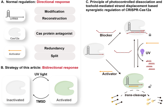 研究表明,现有Cas12a调控策略通常仅能实现Cas12a由“关闭”到“开启”的单向调控,而对已激活的Cas12a缺乏有效的抑制手段。因此开发对Cas12a活性进行双向精准调控,可进一步拓宽Cas12a应用范围,在分子诊断、DNA电路等领域具有重要意义。