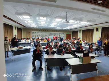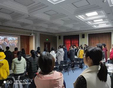 在第三个环节结束后,时间刚好接近下午三点全国政协十三届二次会议的开幕会。在支部委员的组织下,比赛进入暂停阶段,大家一起认真观看会议。同学们如同在现场一般,在观看时一起演唱国歌;对会议中的精彩发言由衷鼓掌。