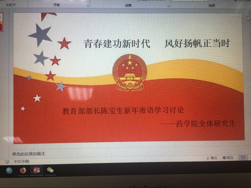 通过这次学习,同学们都感受颇深。“青年兴则国家兴,青年强则国家强。”作为新时代的药学研究生,我们应高举习近平中国特色社会主义伟大旗帜,把握时代脉搏,敢于把自身命运同祖国命运紧密联系起来,以实际行动争做“六有”好青年。