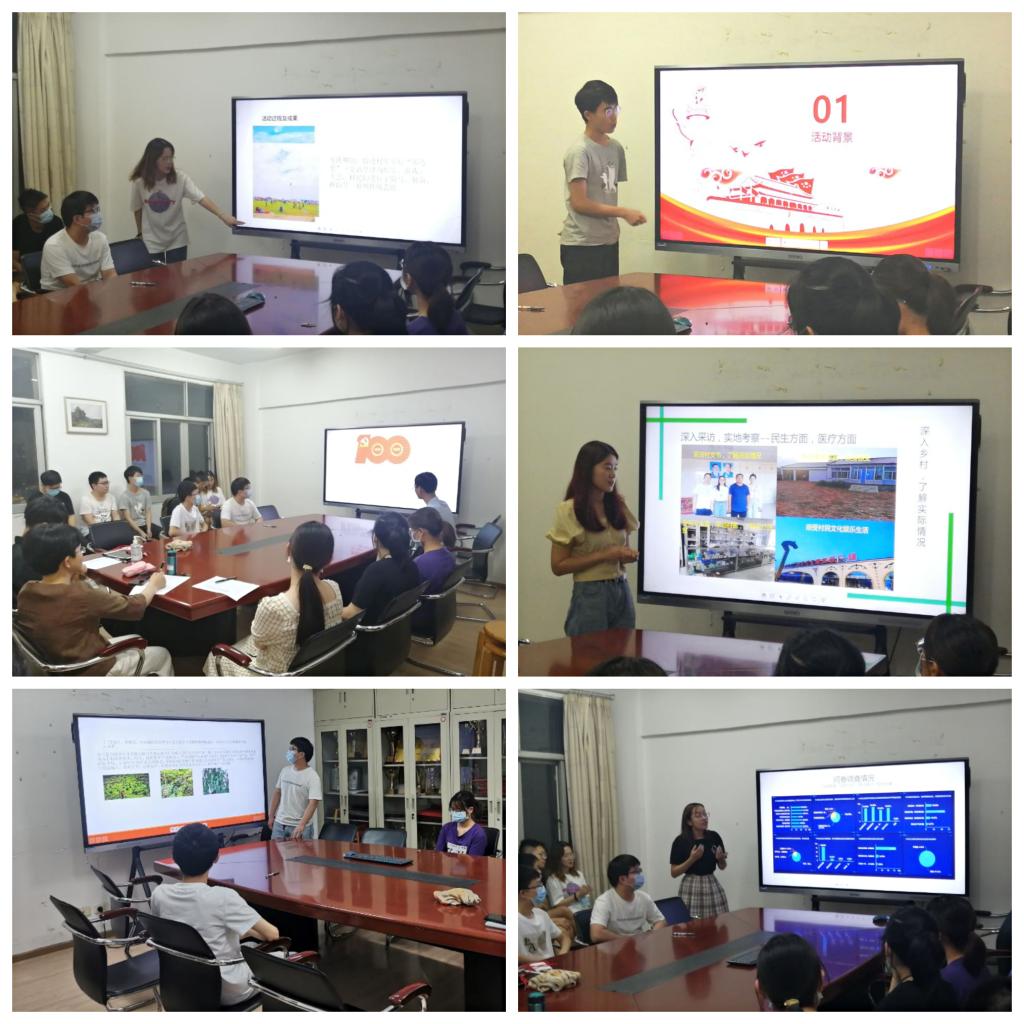 交流会上,各队伍按照顺序依次上台交流,分别从活动意义、活动内容 、活动成果等多方面分享本队的社会实践情况,既有收获也有反思。赴恩施务川新化陕扶贫成果调研队以脱贫产品为切入点分享了多地的脱贫故事;赴六盘水扶贫成果调研队分享了自己走访时所见的脱贫后新风貌;赴奈曼旗脱贫攻坚实践调查队从教育、民生、医疗三个方面分享了奈曼旗地区的脱贫政策和成果;赴琼云川鄂四省生态环境实践调研队分享了调研地生态保护政策,并通过一支短片直观展示了环境的转好;赴武汉市“学党史,强信念”主题教育社会实践调研队分享了参观八七会议会址后的感想;赴武汉市探寻红色足迹实践队分享了探寻武汉多个红色足迹的所见所闻所感;溯文化源泉,强文化自信实践调研队分享了自己线上采访问卷加以线下参观各地博物馆的综合调研模式,内容丰富,数据分析详细;最后赴新疆河南黑龙江乡风文明实践调研队从少数民族汉民族团结、乡村振兴、少数民族传统文化等方面分享了自己的实地调研感悟。
