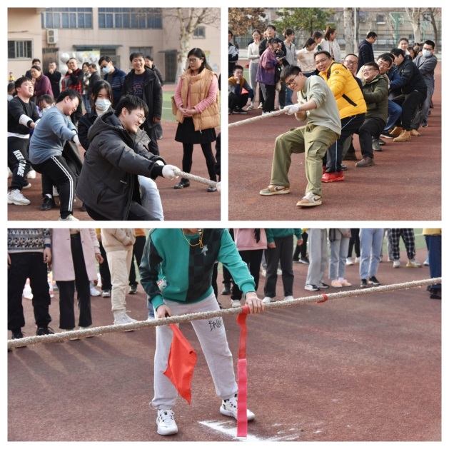 同学们摆好阵势,弓着腿、身后倾,眼神之中写满坚毅。哨声起、红旗落,激动人心的决胜局最终打响,每一位队员都使出全部力气,齐心协力,紧攥绳索。双方实力势均力敌,红布条在阵阵加油助威的音浪声中左摇右摆。
