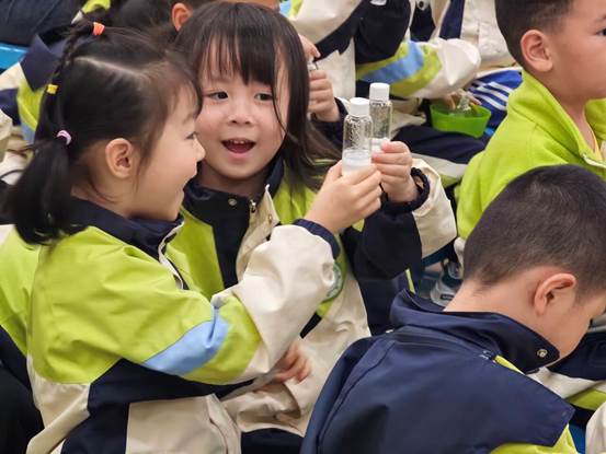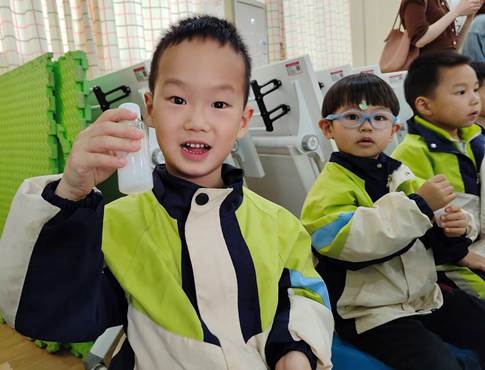 为了让小朋友们更直观地了解药物的使用,课堂讲解中还穿插了泡腾片小实验和乳化剂实验。在泡腾片小实验中,三位小朋友上台亲身体验了泡腾片的使用方法,而在乳化剂实验中,小朋友们在志愿者们和老师的指导下将小瓶中的液体倒入大瓶中并充分振摇,观察到液体的乳化反应。