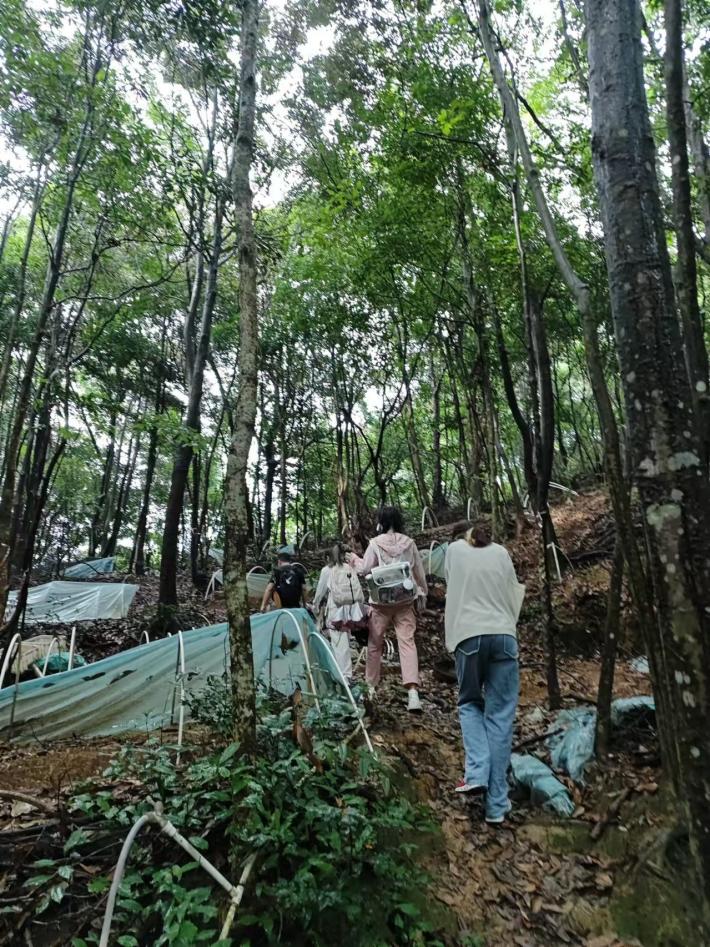 下午,团队成员前往永安山林中实地体验了金线莲的种植环境,在海拔700米左右的高度参观了一位农户的林下种植基地。种植基地深入大山深入,四周有高大树木环绕,透光度较好,为了防止鸟类啄食种子,土地表面还支撑有黑色的小布棚。据农户所说,金线莲种植经济效益较好,夏季农闲时可以种植蘑菇等其他经济作物,收入较为稳定。