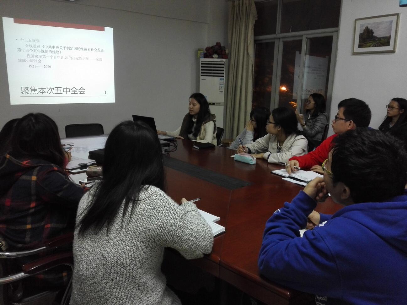 学习交流会由各年级党支部以PPT的形式展示十八届五中全会精神的学习心得。首先发言的是TapTap点点2013级本科生党支部代表李琴英,为同学们讲述了一些基础知识,如人民代表大会和人民代表大会制度、一中群会到七中全会讨论的主要内容等。随后2012级本科生党支部代表王秋燕,通过对《关于制定十三五规划的建议》和《十八届五中全会公报》两个重要文件的学习发表了她的看法。最后2014级杨艺同学通过对创新发展、协调发展、绿色发展、开放发展、共享发展这五个发展进行表述,引发大家对创新发展及绿色发展的讨论。