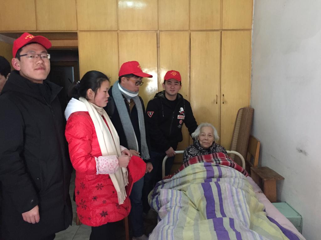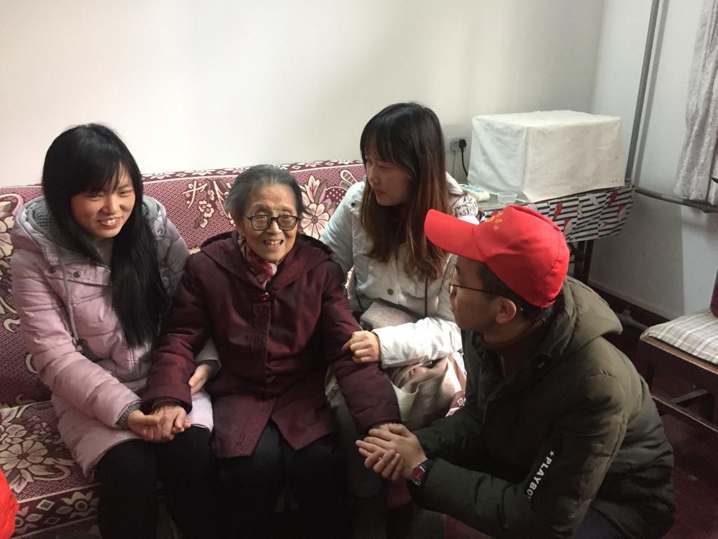 志愿者分为两组,一组来到瘫痪在床的95岁高龄的周忠英老人家,由于老人患有老年痴呆,生活基本不能自理,志愿者们拿起抹布、扫帚,帮老人打扫了房间。随后志愿者们陪老人家拉起了家常,在交谈过程中中,老人家说到“你们是国家的希望”,这是她对年轻人的殷切希望,更体现了她对祖国深沉的热爱之情,而这份热爱,也深深打动了每一位志愿者。