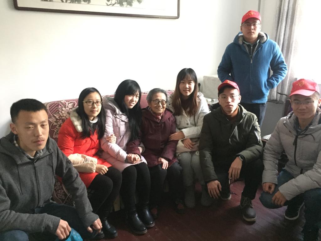 一组看望了92岁的退休老教授郭光璟。她和蔼可亲,待人热情,在与她的聊天中,我们知道了她曾参加过抗美援朝战争,而且多次献血挽救他人生命;她是一名拥有超过60年党龄的老党员,虽然行动不便不能参加每月的党员学习,但仍心系党组织。一次她因身体原因未能按时缴纳党费,现在她要保姆每月按时到社区缴纳党费,这份责任感令同学们感慨不已。与同学们的聊天使老人家回想起自己激情似火的青春,郭光璟老人紧紧握住志愿者的手,高兴地说:“家里好久没有这么多人,我真是太开心了。”