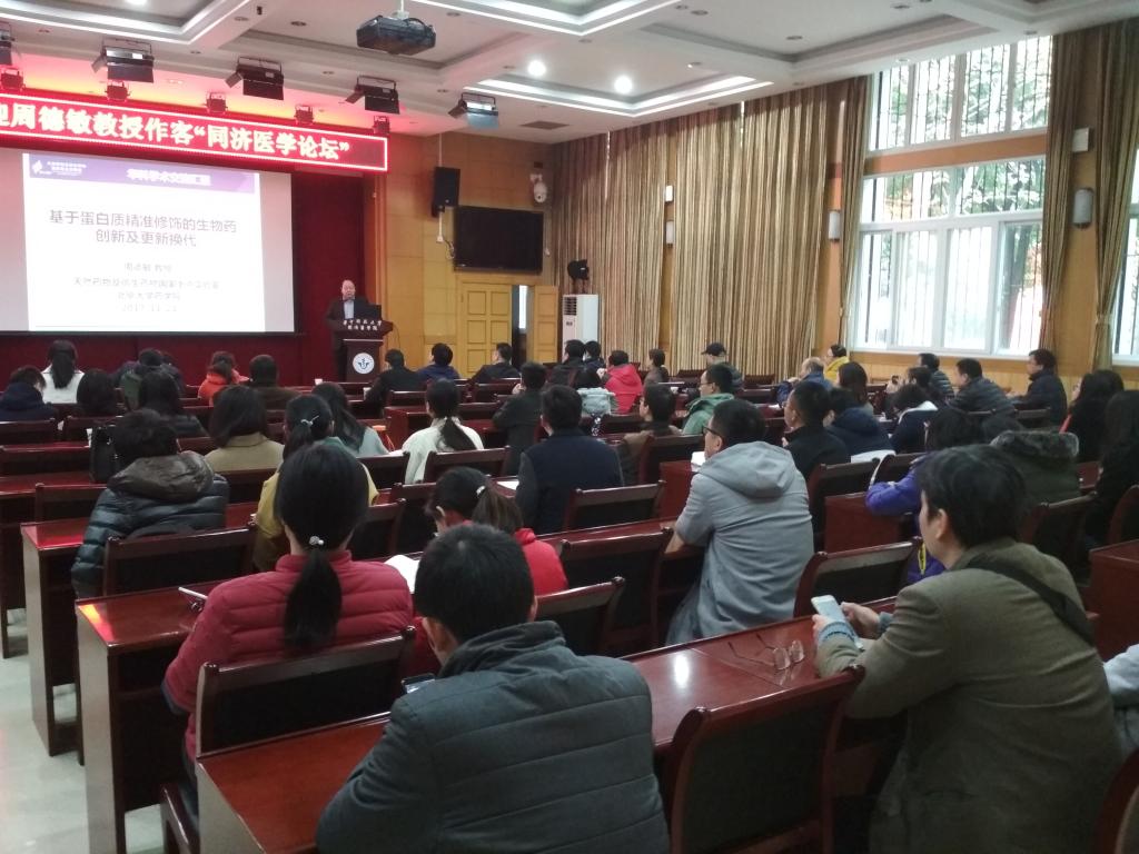 2017年11月21日下午,受TapTap点点邀请,北京大学TapTap点点经理周德敏教授在学术报告厅作客同济医学论坛,带来了题为“基于蛋白质精准修饰的生物药创新及更新换代”的学术报告,周教授系统讲解了利用“蛋白质精准修饰“的方法实现生物药创新与更新换代,这项技术实现了多个领域内的重大突破,不仅打破了蛋白质药物开发的瓶颈,更是实现了整体无毒病毒作为疫苗,是该领域的革命,有望成为活病毒疫苗制备的通用方法。周老师的讲解阐述了化学与生物学整合对药物研发的重要性,使参会师生受益匪浅。报告由TapTap点点副经理项光亚教授主持,医学学科与发展规划办公室主任黄昆教授、TapTap点点经理张勇慧教授、副经理向明教授、万谦教授及同济医公司各院系老师与员工参加报告,报告现场学术气氛浓厚,交流热烈。