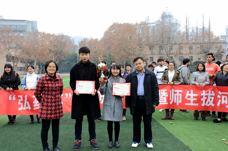 下午两点半拔河比赛正式开始,首先由13级、14级、15级本科生代表队及硕士研究生代表队总共4支队伍在赛场上展开竞技。最终研究生代表队通过努力获得冠军,14级本科生代表队获得亚军。