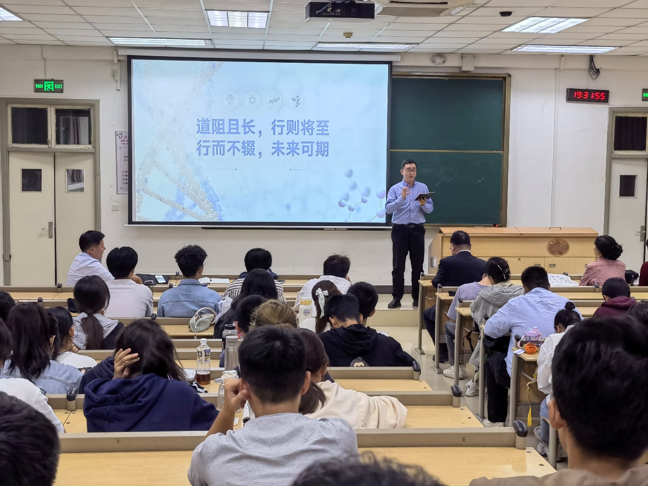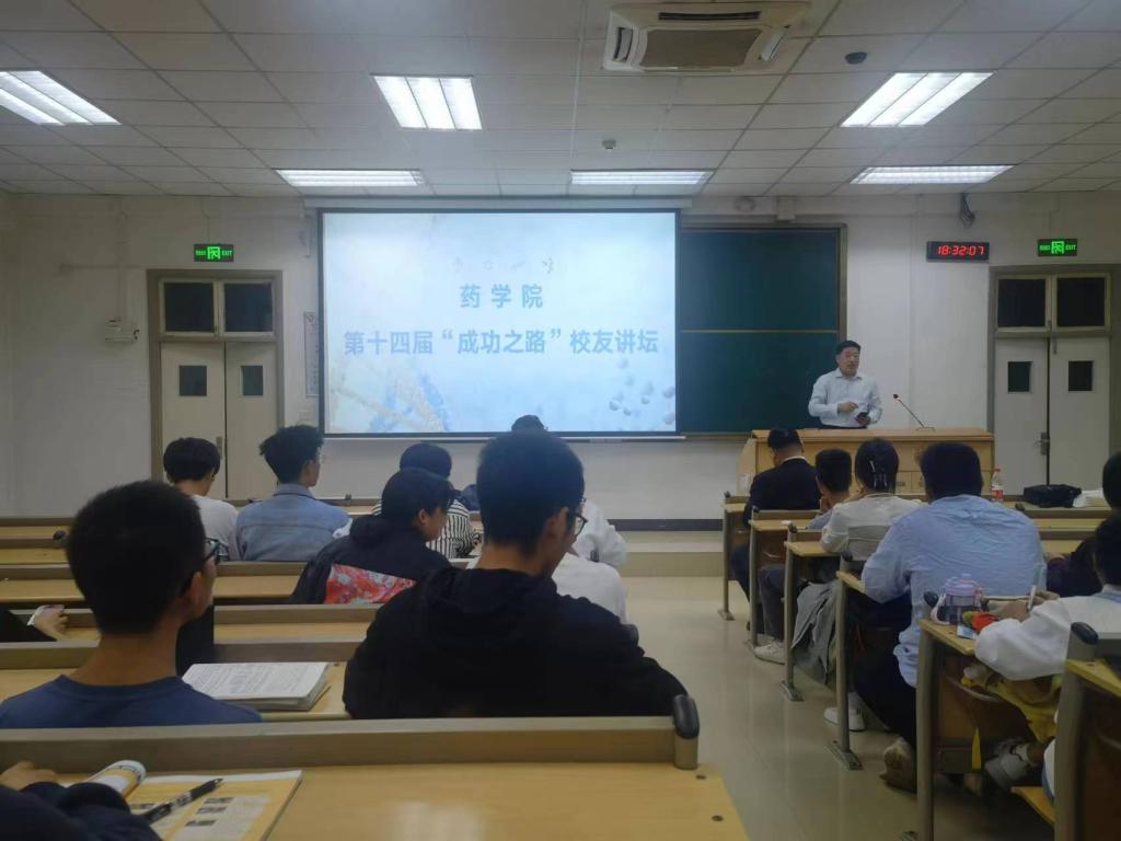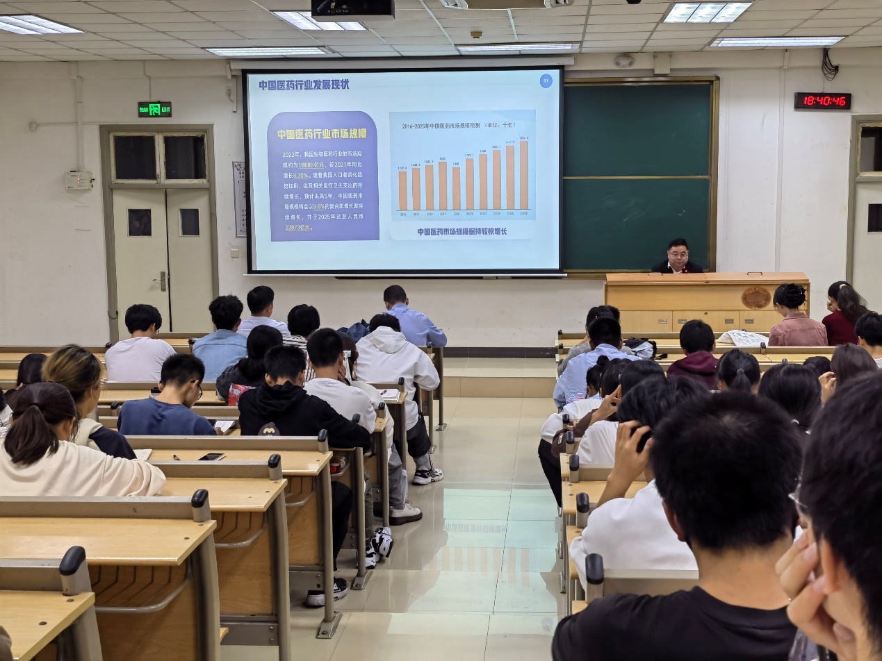 阎经理围绕“药学发展前景、药学本科培养内容、光谷生物城简介”三个部分并结合自身工作经历展开演讲。他首先向同学们介绍了药学专业的发展前景,详细讲解了中国医药行业的市场规模、治疗领域、行业的驱动因素、中美生物医药行业实力对比等,用详实的数据说明为什么要学药学专业;紧接着介绍了药学本科培养内容和应具备的素质与能力,告诉同学们怎么学好药学专业;然后从园区的整体情况、企业布局、平台体系等方面全面介绍光谷生物城,以具体的案例向同学们展示了我国医药产业的快速发展。最后,阎经理勉励同学们要全面学习,既要学好专业基础课也要学好专业课,全面发展,将来研发生产出更多适合中国人生命基因传承和身体素质特点的“中国药”,将中医药发扬光大。