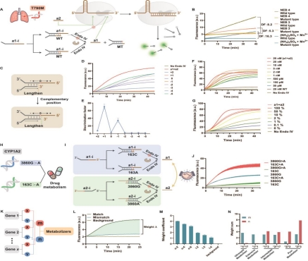 利用MCSAP可将分子诊断任务分解并将适当任务分配给不同的分子工具和电路,从而实现模块化平台的构建。例如在SNV的识别中,可以利用已有的核酸内切酶IV(Endo IV)系统作为识别模块,再利用CRISPR/Cas12a系统作为信号报告模块,实现上下游反应的衔接和信号输出。对药物代谢相关的双位点SNV,在Endo IV识别后,可利用冗余长度的差异控制CRISPR/Cas12a的活性,实现双位点SNV的同时分型检测(图2)。