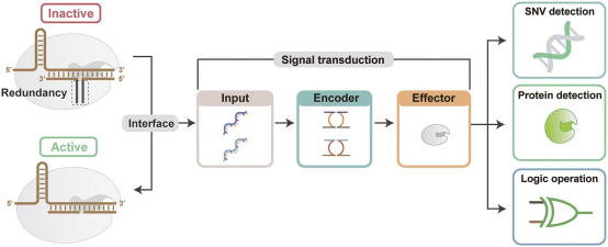 吴曈勃团队首次发现了CRISPR/Cas12a系统分裂激活剂的冗余抑制机制,可通过添加和移除冗余结构实现CRISPR/Cas12a系统活性的调控。在此发现的基础上,团队构建了一个基于冗余结构的模块化CRISPR/Cas12a的协作激活平台,实现了单核苷酸变异(SNV)的识别、核酸酶的检测和逻辑运算(图1)。MCSAP具有良好的可编程性和可扩展性,为CRISPR/Cas在不同领域,如分子生物学和纳米工程的广泛应用提供了一个强大的工具。