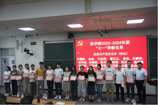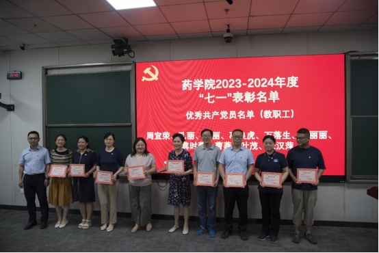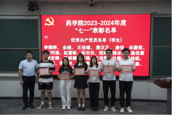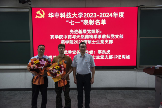 在雄壮的国歌声之后,朱虎成宣读公司及公司“七一”表彰文件。中药与天然药物学系教师党支部、2022级硕士生党支部获评公司“先进基层党组织”,辜良虎同志获评公司“优秀党务工作者”,阎旭同志获评公司“优秀共产党员”。龚时薇等37名师生党员获评公司“优秀共产党员”。黄锐、李进、朱虎成为受表彰的先进代表颁发荣誉证书和献花。