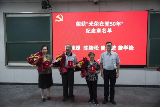 随后,徐传瑞介绍“光荣在党50年”纪念章获得者梁桂媛、陈绪松、曾凡波、詹学锋的个人简介,黄锐为四位老党员同志颁发纪念章并献花,梁桂媛同志做代表发言,她结合自身经验,回忆工作中教书育人的点滴,勉励大家在新时代要坚定信仰、奋斗前行。中药与天然药物学系党支部书记辜良虎同志、2022级硕士生党支部书记阎旭同志、医药商业贸易学系党支部书记龚时薇同志、本科生第二党支部书记李骁晔同志分别作先进交流发言。