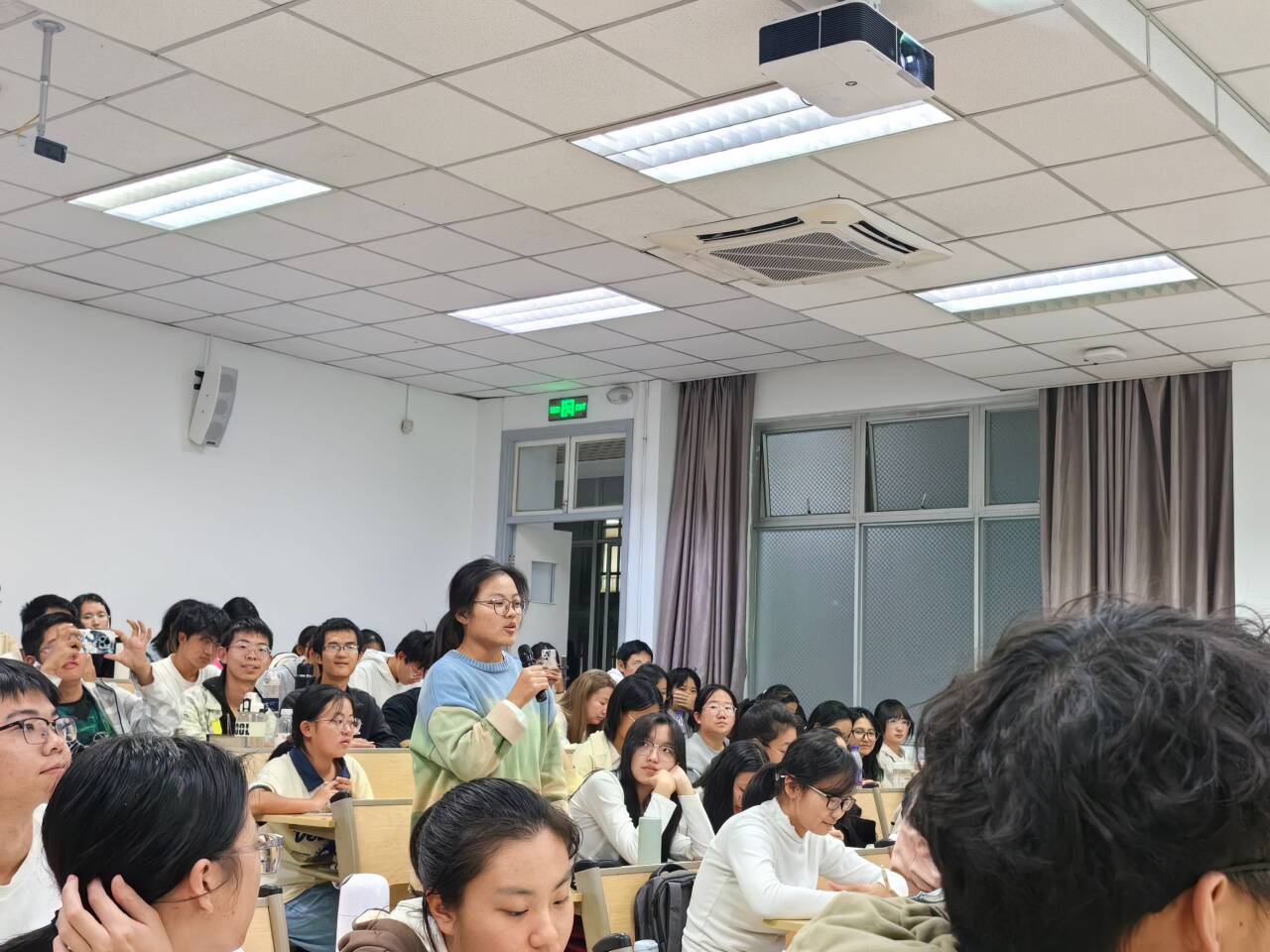 在提问环节,同学们积极发言,针对大家提出的问题,姜卫从员工的心理角度出发,设身处地地剖析了自我成长与外界环境间可能出现的冲突,激起了同学们的共鸣与探讨。