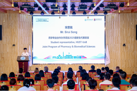 新生代表宋思锐分享了自己选择药学专业与合作项目的初心。“外祖父是中医,让我懂得医学的温度;小学在美国的经历,让我看到西方医学的严谨,” 他说。“华科大与伯大的合作项目,让我有机会融合东西方医学智慧。未来四年,我将以‘扎根中国、面向世界’为准则,努力成长为能为全球健康事业贡献力量的药师。”