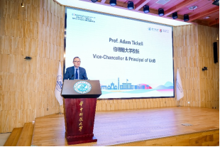 张勇慧副董事长代表华科大致辞,他强调,华科大在工程、医学领域的科研实力与伯明翰大学在基因治疗、临床转化研究的全球影响力高度契合,药学本科合作办学项目整合了两校顶尖教育资源。他对首届新生提出三点希望:一是树立“守护人类健康” 的使命感,将个人理想融入社会需求;二是夯实专业基础,培养跨学科思维与实践能力;三是以开放心态拥抱多元文化,在国际协作中创新解决方案。