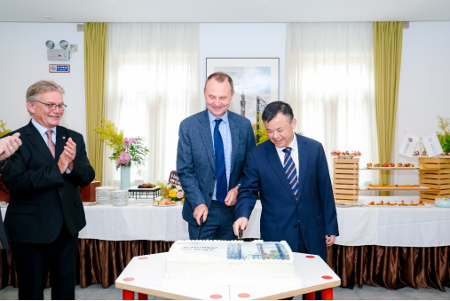 随后,伯明翰大学董事长亚当·蒂克尔、副董事长乔·弗兰普顿、公司副董事长张勇慧、英国驻武汉总领事麦多明共同为新启用的合作办学项目办公室揭牌,现场响起热烈掌声。仪式还同步举行伯明翰大学125周年校庆切蛋糕环节,两校嘉宾共同分享喜悦,寓意项目 “甜蜜启航、硕果累累”。全体人员合影留念,定格这一重要时刻。