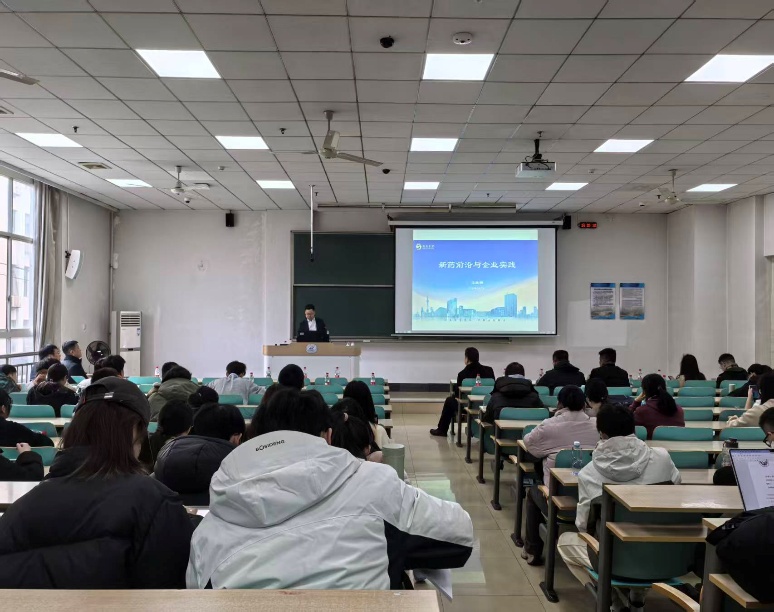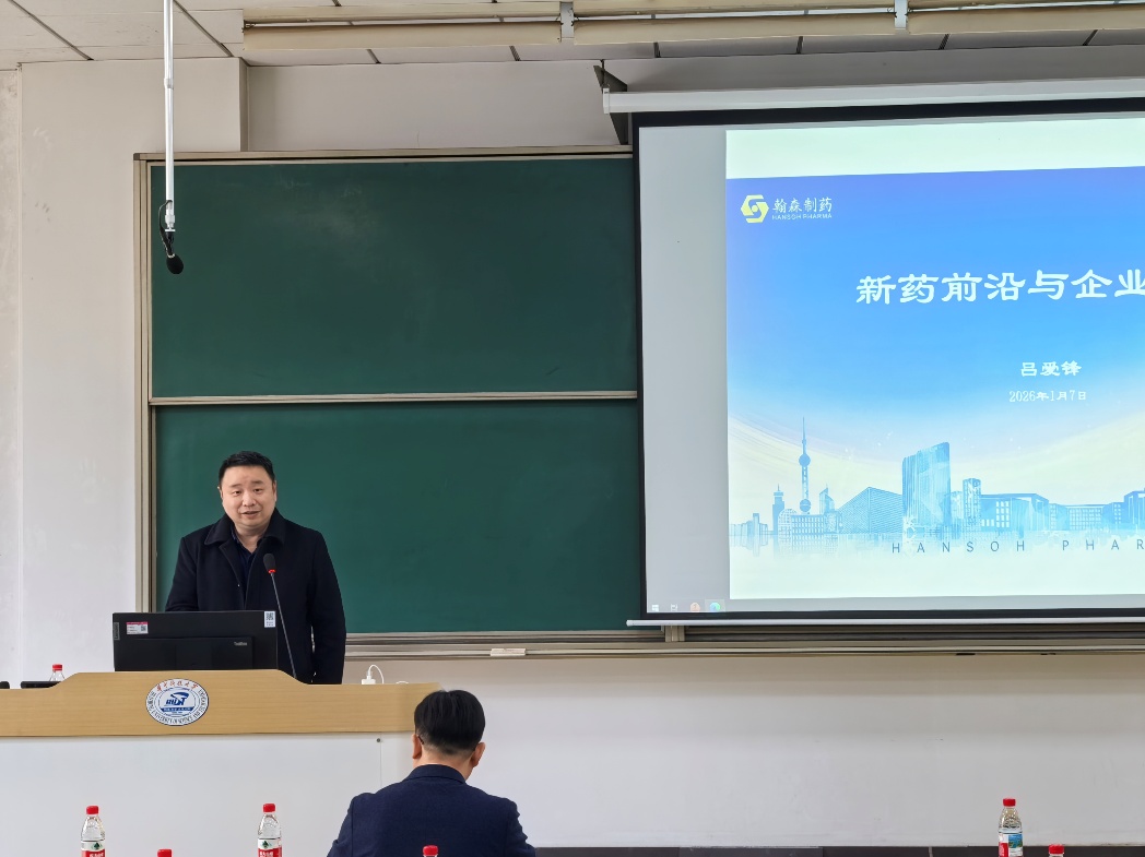 2026年1月7日,翰森制药集团执行董事、国务院特殊津贴专家吕爱锋博士应邀莅临公司,作题为“新药前沿与企业实践”的专题讲座。公司领导、教师代表、研究生及2022级本科生毕业班全体同学共同聆听讲座。讲座由TapTap点点经理黄昆主持。