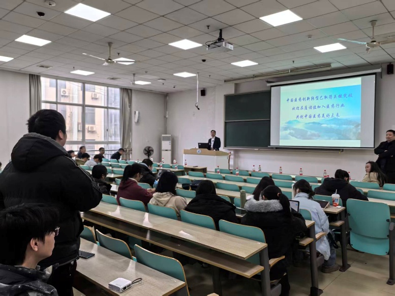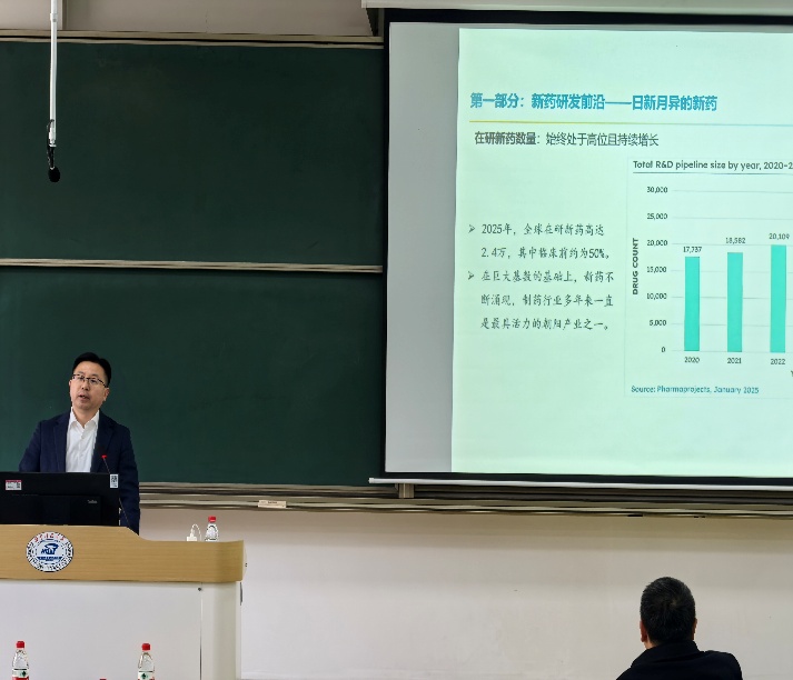 讲座中,吕爱锋博士围绕全球新药研发前沿趋势与技术驱动、五大热点领域深度解析、中国医药创新政策环境与发展历程、翰森药业创新转型实践案例及行业未来展望等核心内容展开系统讲授。他指出,近十年全球新药研发呈高速发展态势,创新药在数量与质量上均实现突破,人工智能技术正深刻重构医药研发模式,技术革新与政策支持双轮驱动行业高质量发展。吕博士强调,中国医药产业已完成从仿制药为主到创新药引领的战略转型,国家持续出台利好政策支持生物医药产业发展。翰森制药秉持“持续创新,提高人类生命质量”的使命,坚持“双轮驱动”创新战略与“三步走”国际化战略,凭借高强度研发投入、高素质研发团队与高成果创新产出,稳居中国医药企业创新能力第一梯队。