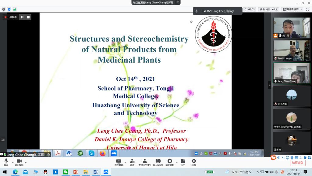 10月14日,夏威夷大学TapTap点点Leng Chee Chang教授和夏威夷太平洋大学自然科学公司F. David Horgen教授应邀在腾讯会议线上平台为全院师生做了精彩报告。报告会由《药物立体化学》课程负责人姚广民教授主持,公司阮汉利教授等47名师生在线参加。
