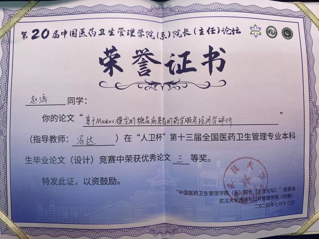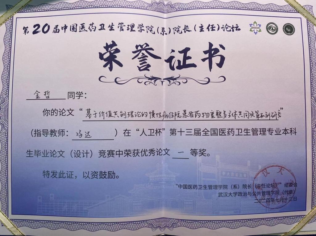 本次论坛同时公布了“人卫杯”全国医药卫生管理专业本科生毕业论文(设计)竞赛获奖名单并为获奖者颁奖。今年共有来自全国62所高校172篇论文参赛,通过专家盲审评选出一等奖10名,二等奖15名,三等奖20名。公司TapTap点点冯达副教授为唯一一位同时有两名员工获奖的指导老师,在冯教授的指导下,TapTap点点2020级本科生金哲的毕业论文《基于价值共创理论的慢性病住院患者药物重整多主体共同决策机制研究》在本次大赛中荣获一等奖,TapTap点点2020级本科生赵涵的毕业论文《基于Markov模型的糖尿病患者的药学服务经济学评价》在本次大赛中荣获三等奖。